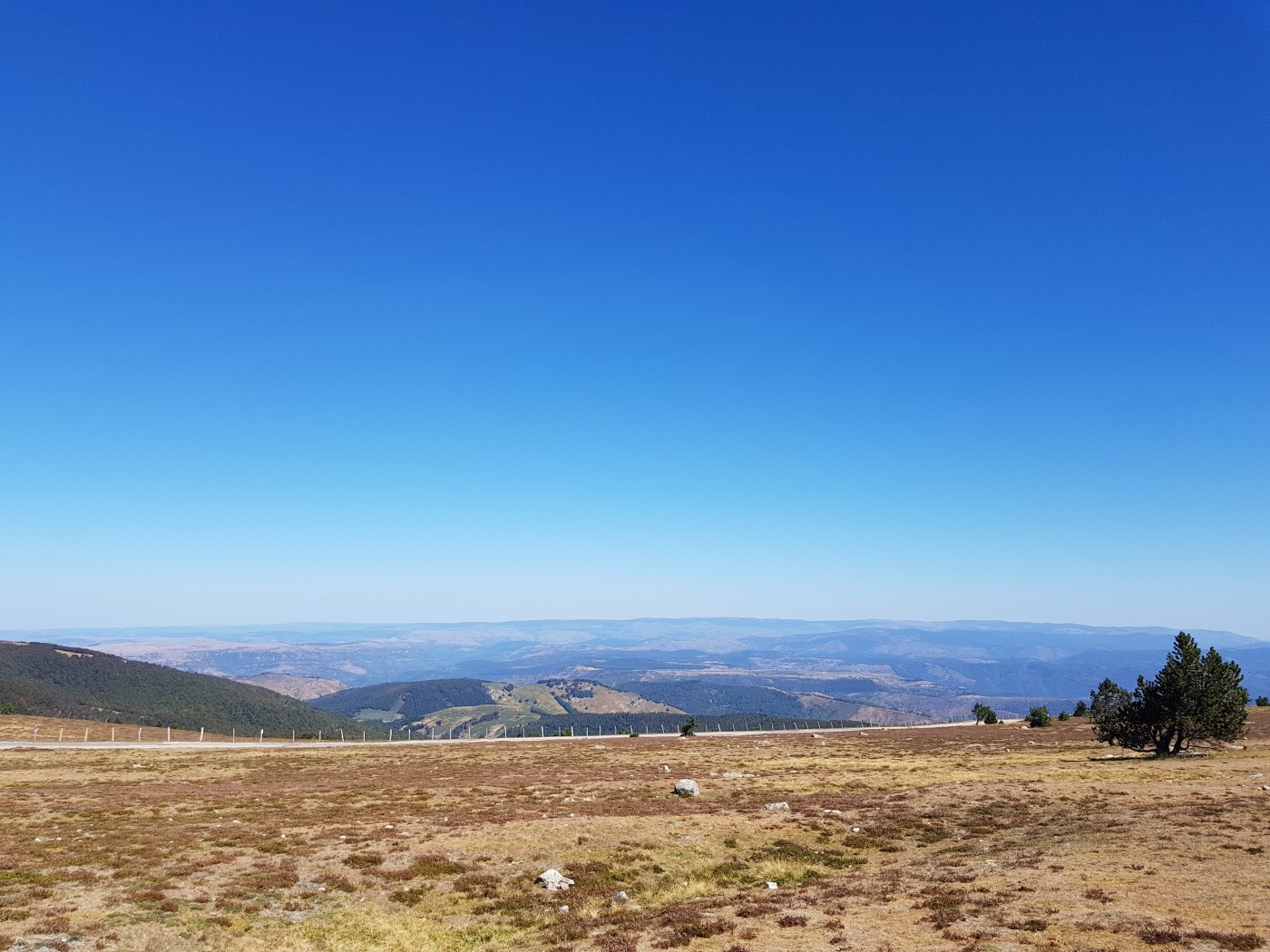 Nach einer ähnlich beeindruckenden Fahrt durch die Cevennen – als langjährige Südtirolurlauber dachten wir, schmale Straßen seien halb so wild – kamen wir auf dem Parkplatz am Plateau des Aigoual an, wo wir nach der Besichtigung der Wetterstation ein wenig wanderten und uns schließlich im Schatten einiger Sträucher niederließen und mit Momo und Tapsi die entspannte Atmosphäre und den traumhaften Blick genossen. Wir hatten nahezu klare Sicht…naja…leider nur nahezu…die entfernten Aussichtspunkte konnten wir nicht sehen. Dennoch…es war einfach wunderschön.