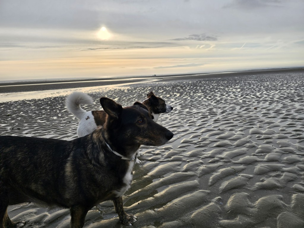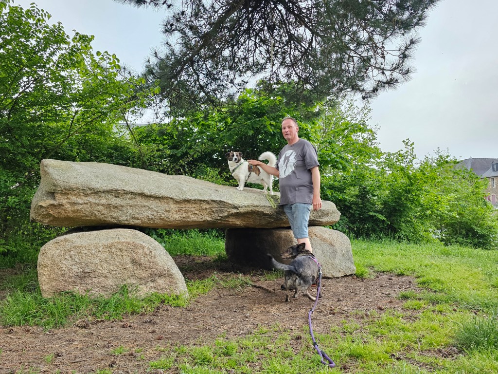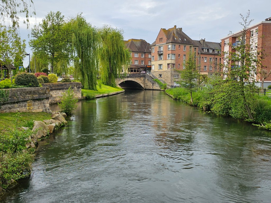 Ein dreiwöchiger Trip durch die Normandie und die Bretagne stand an. Die Vorfreude war wirklich riesig und irgendwie hatten wir die Erholung nach der Gartenumgestaltung wirklich nötig. So ging es am 06.05.2023 los. Zum ersten Ziel hatten wir Le Treport in der Normandie auserkoren, wo der Stellplatz auf der Steilküste liegt und ein Aufzug die dort residierenden Gäste hinunter in den Ort bringt. Coole Lösung. Aber…als wir eintrafen war er voll. Etwas, was wir auf dem gesamten Trip entgegen einiger Vorhersagen nur ganz selten erleben sollten. Mit Blick auf die herrliche Steilküste und ruhig daliegende Meer überlegten wir uns eine Alternative. Strike… Wenige Fahrminuten entfernt lag Eu und bot einen Stellplatz. Wir richteten uns kurzerhand ein und zogen erst einmal mit den Hunden los. Die erste große Tour ohne den Tapsebären und den ersten Stellplatz der Tour unweit eines lauschigen Bächleins. Er hätte es toll gefunden, auf dem Trampelpfad an dessen Ufer langzustaksen. Spannend hätte er sicher auch die Katzencamper gefunden. Einige der Mitcamper hatten nämlich ihre Miezen dabei, die sie zwischendurch wie einen Hund an der Leine ausführten.