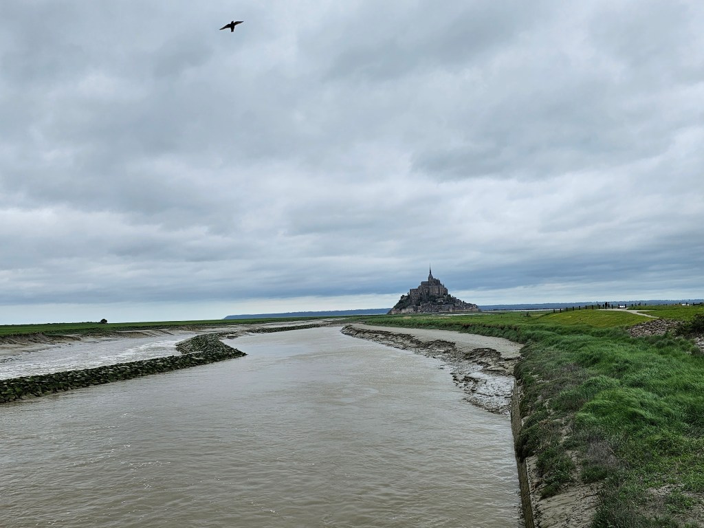 Die Grenze zwischen Normandie und Bretagne war unser nächstes Ziel. So sehr uns ein Besuch des Mont Saint Michel abschreckte, so gerne wollten wir einfach einmal den Blick auf den abteigekrönten Berg werfen. Warum schreckte uns der Besuch auf dem Berg selbst ab? Ganz einfach – ein Ort der 27 Einwohner beherbergt, allerdings jährlich von 2,8 Millionen Touristen besucht wird, ist in den allerseltensten Momenten so ruhig, dass er dazu einlädt, ihn in entspannter Atmosphäre zu erkunden. Lediglich früh am Morgen und am späten Abend soll man, so lasen wir, die Chance dazu haben. Uns genügte es in dem Fall allerdings wirklich einen Blick auf ihn zu erhaschen. Unseren Stellplatz – wieder Camping-Car-Park – fanden wir dafür in dem kleinen Ort Beauvoir. Von hier konnte man über einen Weg am Couesnon entlang zum Berg hinüber laufen und den Ausblick auf den ruhenden Riesen auf Bänken über dem Wasser sitzend genießen und auf sich wirken lassen – ebenso das Treiben der verschiedenen Menschen aller Nationen vom gläubigen Pilger zum aufgestylten Perfect-Shot-Suchenden verfolgen. Asche auf mein viel zu früh ergrautes Haupt, manchmal mache ich das tatsächlich sehr gerne.