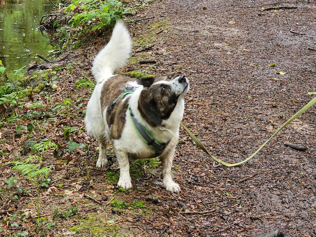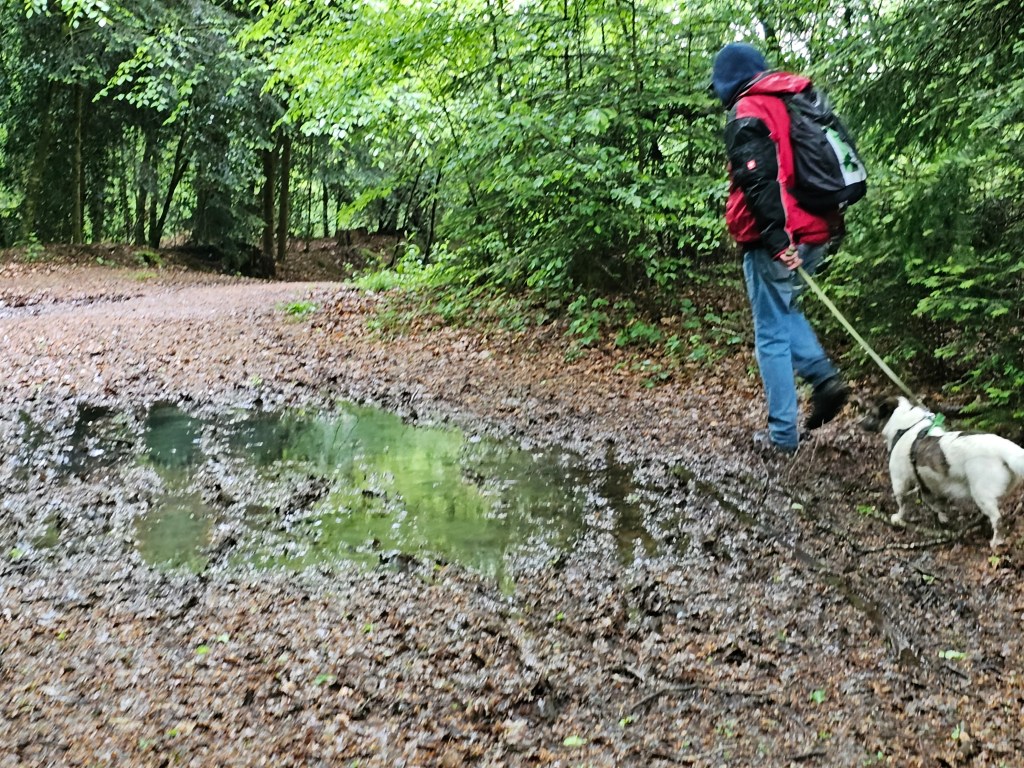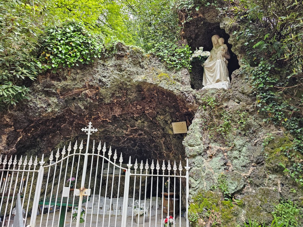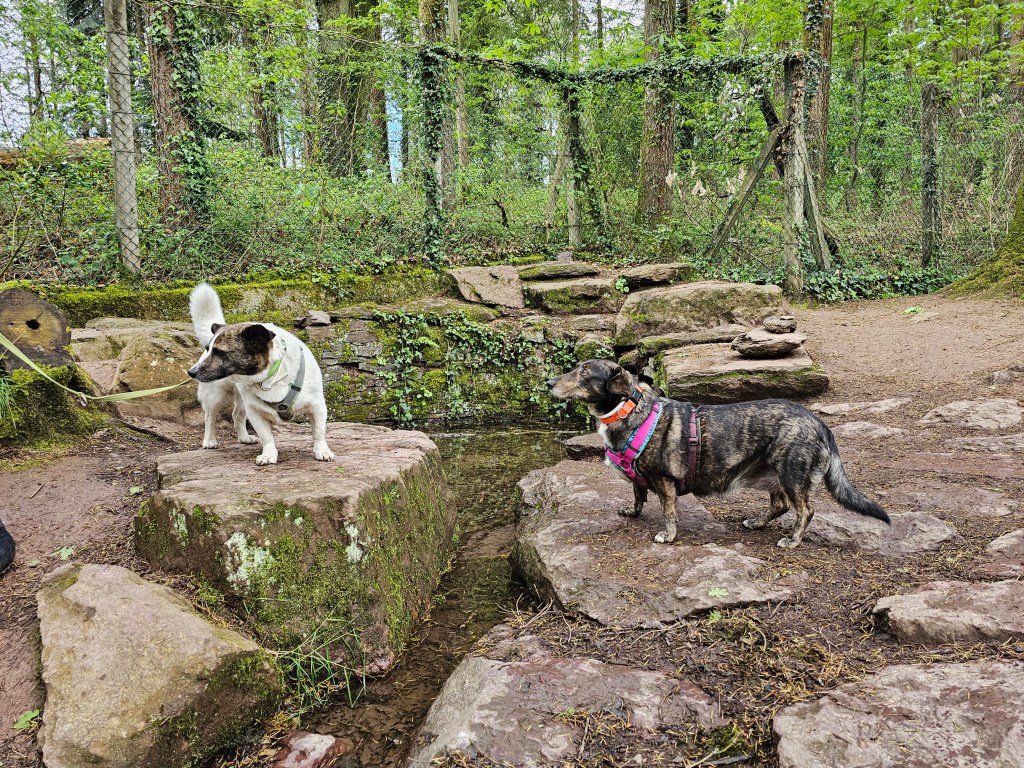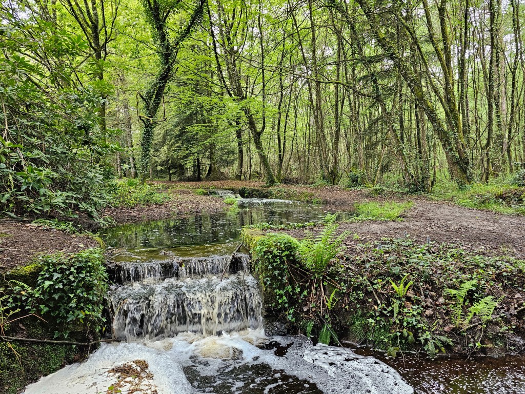 So ging es gleich abends los zu einem Spaziergang. Durch ein Tor traten wir auf einen breiten Wanderweg und folgtem ihm in den Wald hinein. An der Grotte Notre Dame de Paimpont kamen wir aus dem Staunen kaum heraus, Bächlein, Teiche, kleine Wasserfälle, eine kleine Mariengrotte. Ein Stück weiter der See von Paimpont. Von unserem Platz aus, konnten wir einen Blick auf die Abbaye erhaschen. Über Stege gingen wir durch einen Wald. Ein toller Spaziergang mit herrlichen Ausblicken in einer irgendwie unwirklichen Atmosphäre. Auch für die Hunde eine großartige Sammlung neuer Eindrücke, die sie spürbar genossen.