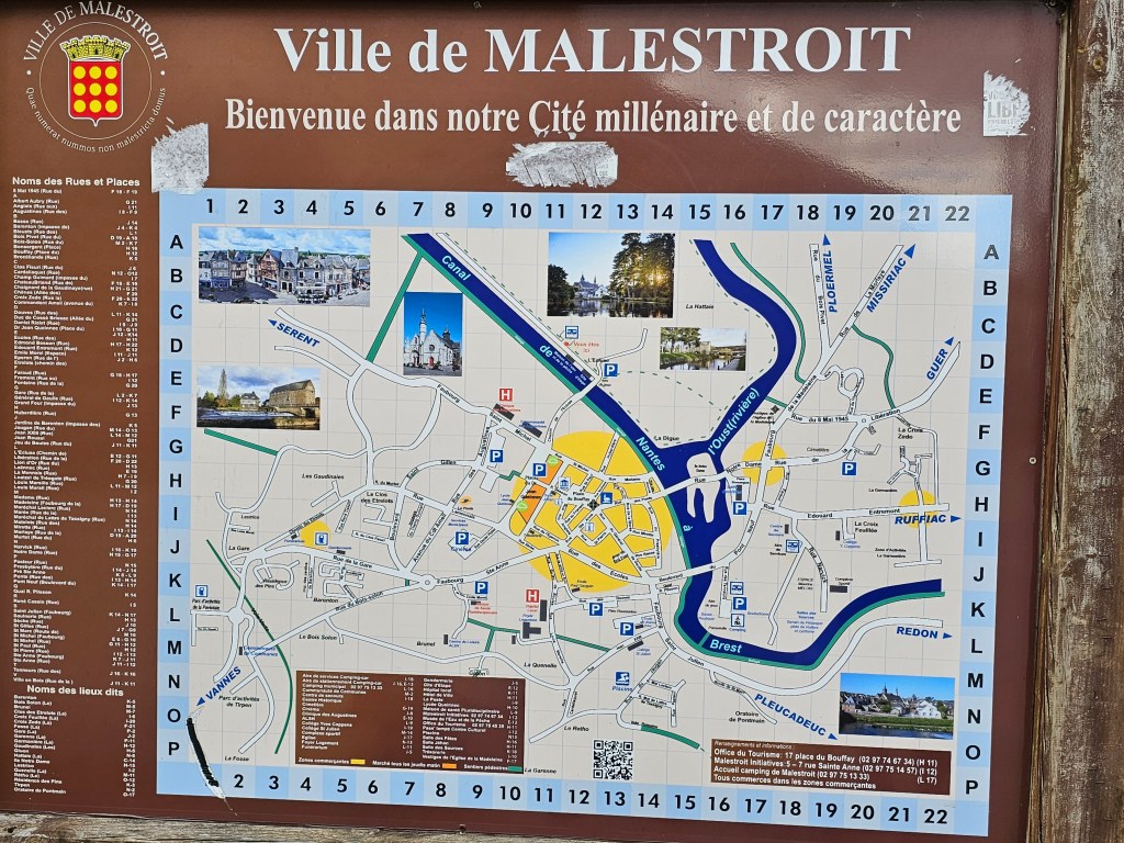 Malestroit war unser nächstes Ziel. Hier fand sich ein – laut Bewertungen auf Capercontact seit Juli 2023 geschlossener – Stellplatz direkt am Kanal von Nantes nach Brest. Malestroit – ein herrliches, kleines, mittelalterliches Städtchen in der Flussschleife des Oust. Schmale, enge Gassen laden zu Spaziergängen genauso wie der Treidelpfad am Rande des Kanals.
