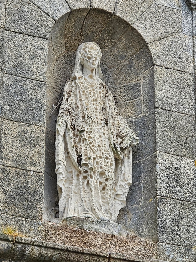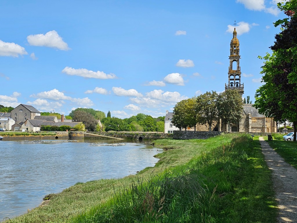 Gefunden war schnell ein kleiner Ort voller Charakter, zauberhaft am gleichnamigen Fluss gelegen und herrliche Wandermöglichkeiten bietend: Le Faou. Der Stellplatz von Camping Car Park war gut ausgewiesen und in Ermangelung von Strom und Sanitär sogar kostenlos. So stand Groot ruhig auf einer Wiese und wir hatten es nicht weit zum kleinen, zauberhaften Stadtkern, wo wir durch die engen, gepflasterten Gassen zwischen schiefergedeckten Fachwerk- und Giebelhäusern flanieren konnten. Einer der wenigen Orte Frankreichs, an dem die Häuser in ihrer ursprünglichen Form bei der auch die feingearbeitete Schieferfassade, die das Haus individualisierte, erhalten blieb. Auch die schöne Kirche „Saint Sauveur“ lockte uns. Vom einstigen hohen Status als Tor zum Meer und als Poststation zeugte noch der eindrucksvolle Place de la Mairie. Und war das zuviel an Kultur, so bot sich ein herrlicher Weg entlang des Flusses durchs Grüne an.