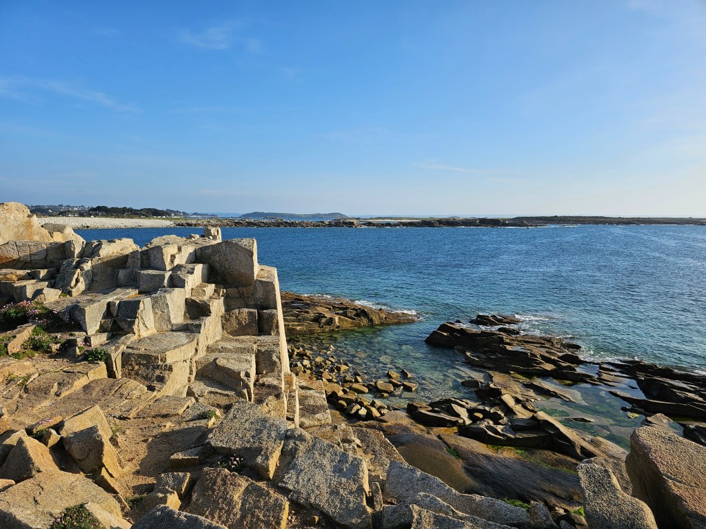 Auf der Ile Grande wurde lange Zeit Granit abgebaut, Granitsteine, Spuren im Fels, aber auch ein Denkmal erinnern daran.