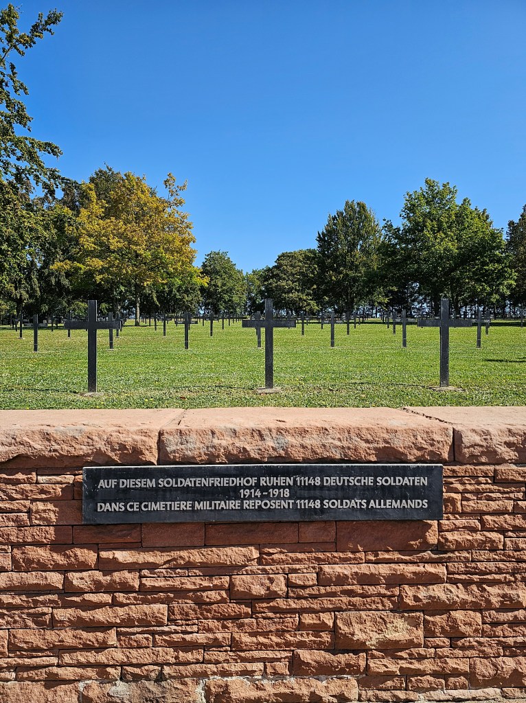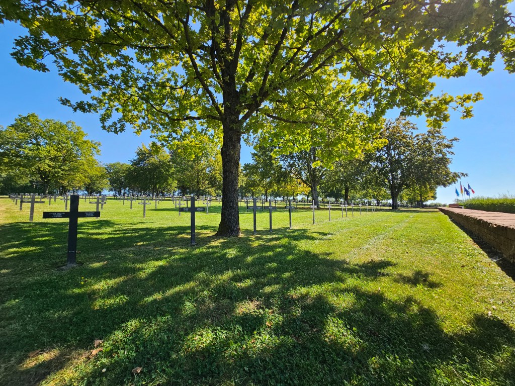 „Wer an Europa zweifelt, der sollte Soldatenfriedhöfe besuchen, dort kann man sehen, wozu das Nicht-Europa, das gegeneinander der Völker, das Nicht-Miteinander-Wollen, das Nicht-Miteinander-Können führen muss.“ Jean-Claude Juncker. Wir glauben an die europäische Idee und sind froh über ein geeintes Europa. Dennoch war ein Soldatenfriedhof der erste Ort, den wir am folgenden Tag besuchten. Der deutsche Soldatenfriedhof von Consenvoye, auf dem 11.146 Menschen ihre letzte Ruhestätte fanden. Eine bloße Zahl, der im Verlaufe dieser Woche noch weitere, weitaus höhere Zahlen folgen würden. Eine bloße Zahl, die gepaart mit Kreuzen und Grabplatten wie -steinen von vergangen Leben, von Schmerz und Trauer spricht. In Ruhe und Frieden liegen sie nun allesamt hier unter grünem, weichen Gras, im Schatten noch junger Bäume, den Blick auf die Meuse gerichtet. Vergessen werden sollten sie nie.