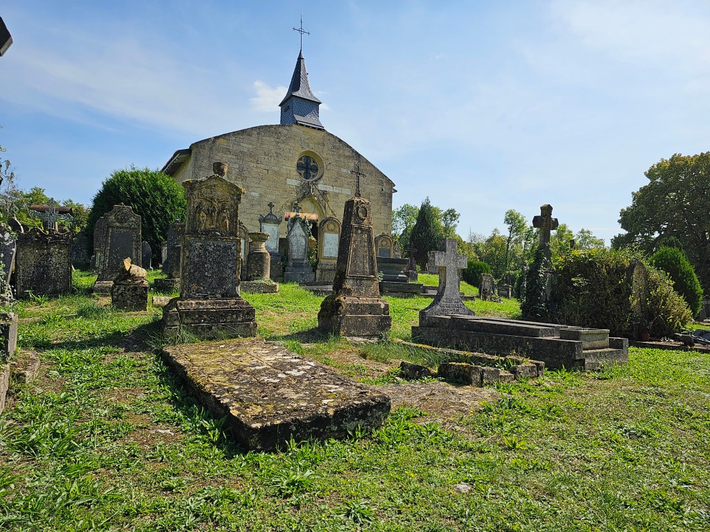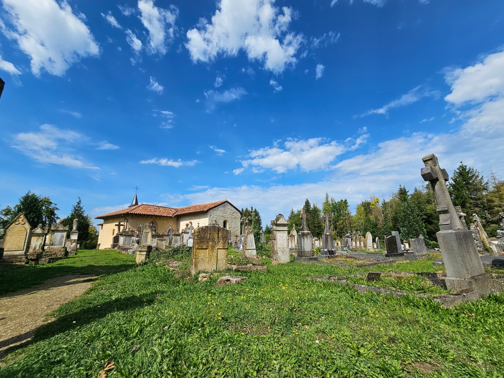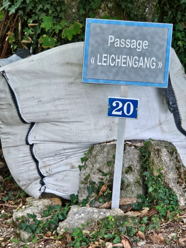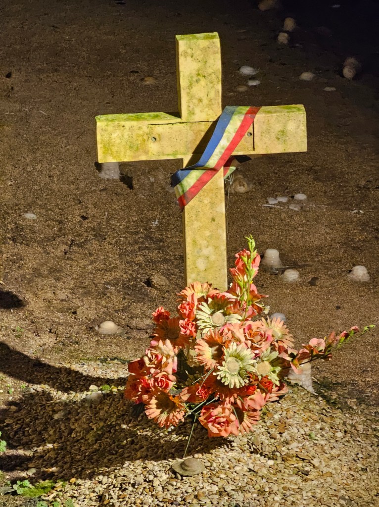Auch am Mittwoch war der Gevatter unser Begleiter…auf dieser Reise war er wirklich stetig um uns. Doch dieses Mal zunächst unabhängig der Kriegsgeschehnisse. Es war der Cimetière Saint Hilaire, den wir besuchten. Auf einem Hügel liegt dieser wunderschöne Friedhof auf dem sich Gräber aus vielen hundert Jahren bis ins Heute finden, aber auch ein Beinhaus. Noch bevor man den Friedhof selbst betritt sieht man zu seiner rechten den Christus der Aussätzigen, der von den vergangenen Leben der Lepraopfer aus der Maladerie erzählt. An seiner Seite die Jungfrau der Aussätzigen. Beide inzwischen hinter Gittern geschützt vor Zerstörung.