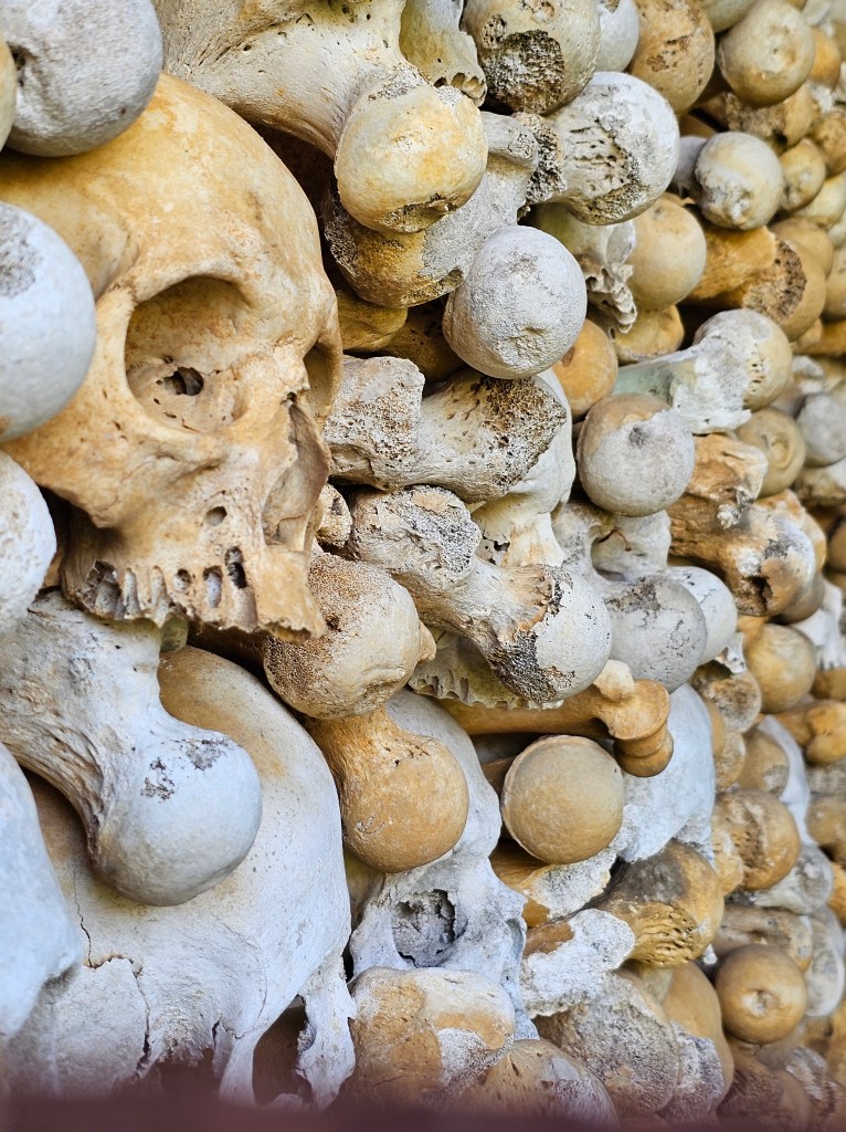 Und hinter rostigem Eisen dann in einem gemauerten Raum…drei Wände vom Boden bis an die Decke mit Knochen und Schädeln bedeckt, in ihrer Mitte ein Altar, auf dem weitere Schädel ruhten. Der Verfall hatte auch hier nicht halt gemacht. 40000 Schädel ruhen hier, so steht es auf einem Schild. Eine tiefergehende Erläuterung spricht von 6000 Schädeln und weiteren Knochen. Wie viele auch immer es sind…sie sind wie wir und wir werden sein wie sie. Wie wahr diese Worte doch sind… Beten wir also für sie.