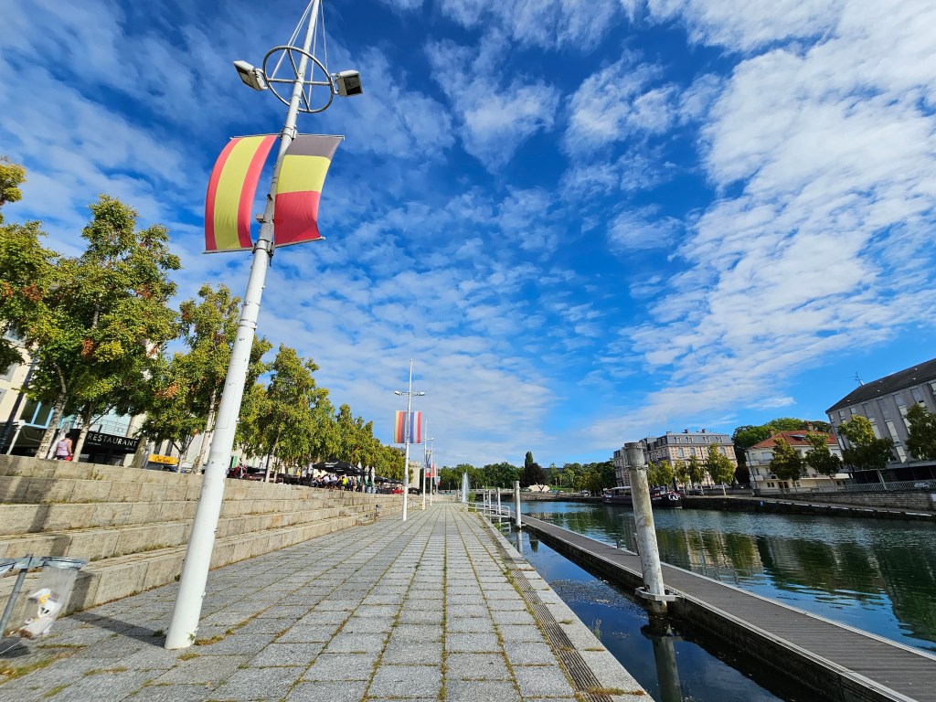 Als wir zum ersten Mal hier durchgefahren waren, war es Sonntag und sämtliche Cafés hier am Ufer waren proppevoll. Viele Menschen saßen und flanierten unter den wehenden Fahnen am Meuseufer. Heute hielt sich das in Grenzen. Es war eher wenig los. Die meisten Menschen waren dann doch arbeiten. Doch ich gestehe, so ist mir das auch viel lieber, als wenn der Ort so voll ist. Daher zieht es uns selten und wenn eher zu „Unzeiten“ in Gegenden, die touristisch sehr beliebt sind.