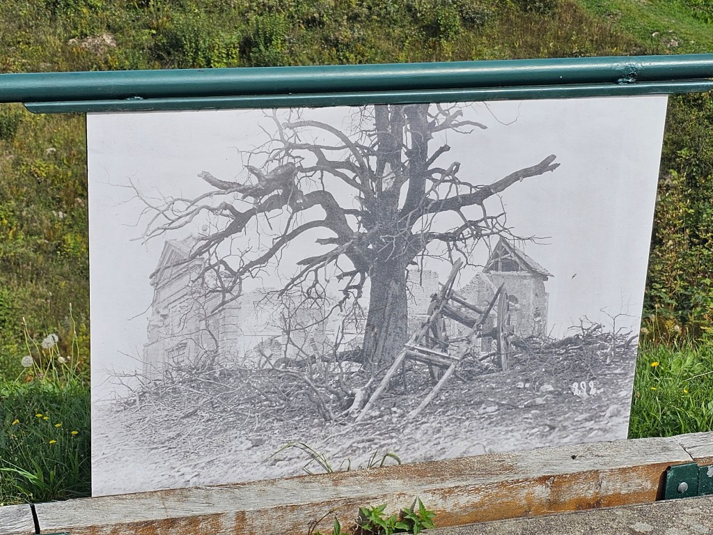 Von Consenvoye aus führte unser Weg nach Haumont, wo wir eines der zerstörten Dörfer besuchen wollten. Gut, Kopfschmerzen und fast dreißig Grad sind nicht die besten Bedingungen, eine Wanderung von rund 2 km bergan zu machen, aber wir schafften es und während ich mich mit den Hundedamen erst einmal sammelte, durfte Stefan sich den Ort schon einmal anschauen, an dem die Natur – wie so oft hier – die Decke des Lebens über den Tod und das Leid gebreitet hatte.